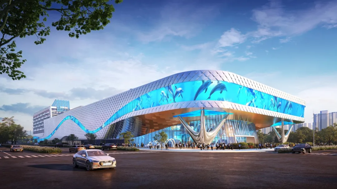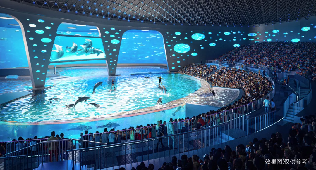 其中,鲸豚剧场为5000个座位的大型现代化剧场,是国内最大的室内鲸豚剧场之一,包含水幕演出、音乐舞美、巡游互动、空中剧场等。
